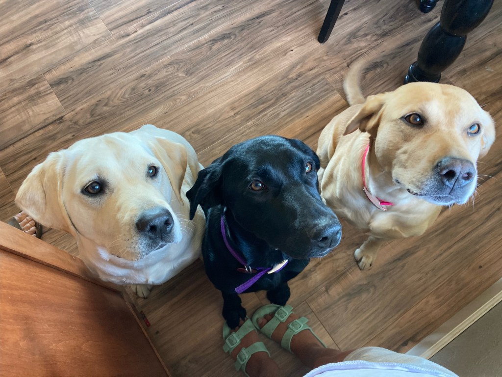Cali had three litters of puppies and is now retired and enjoying her role as a grandma. Ray is from Cali’s first litter and is the prettiest dog you’ll ever see. She’s also eager to please and a great family dog. Nina is the youngest and is a ball of energy that charms everyone she meets.